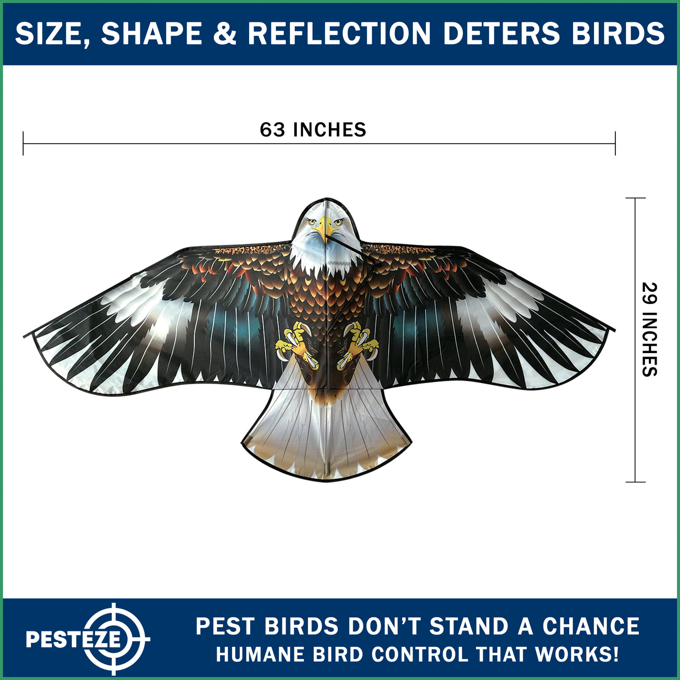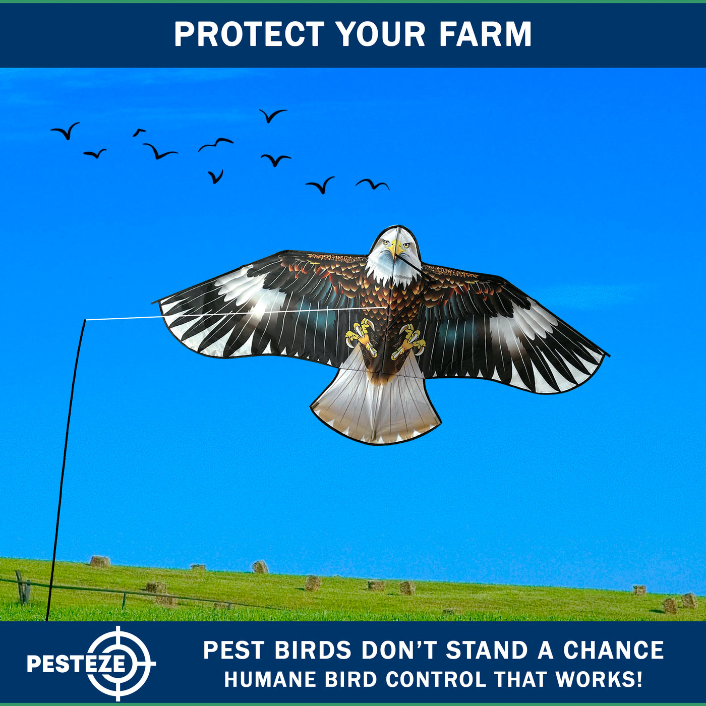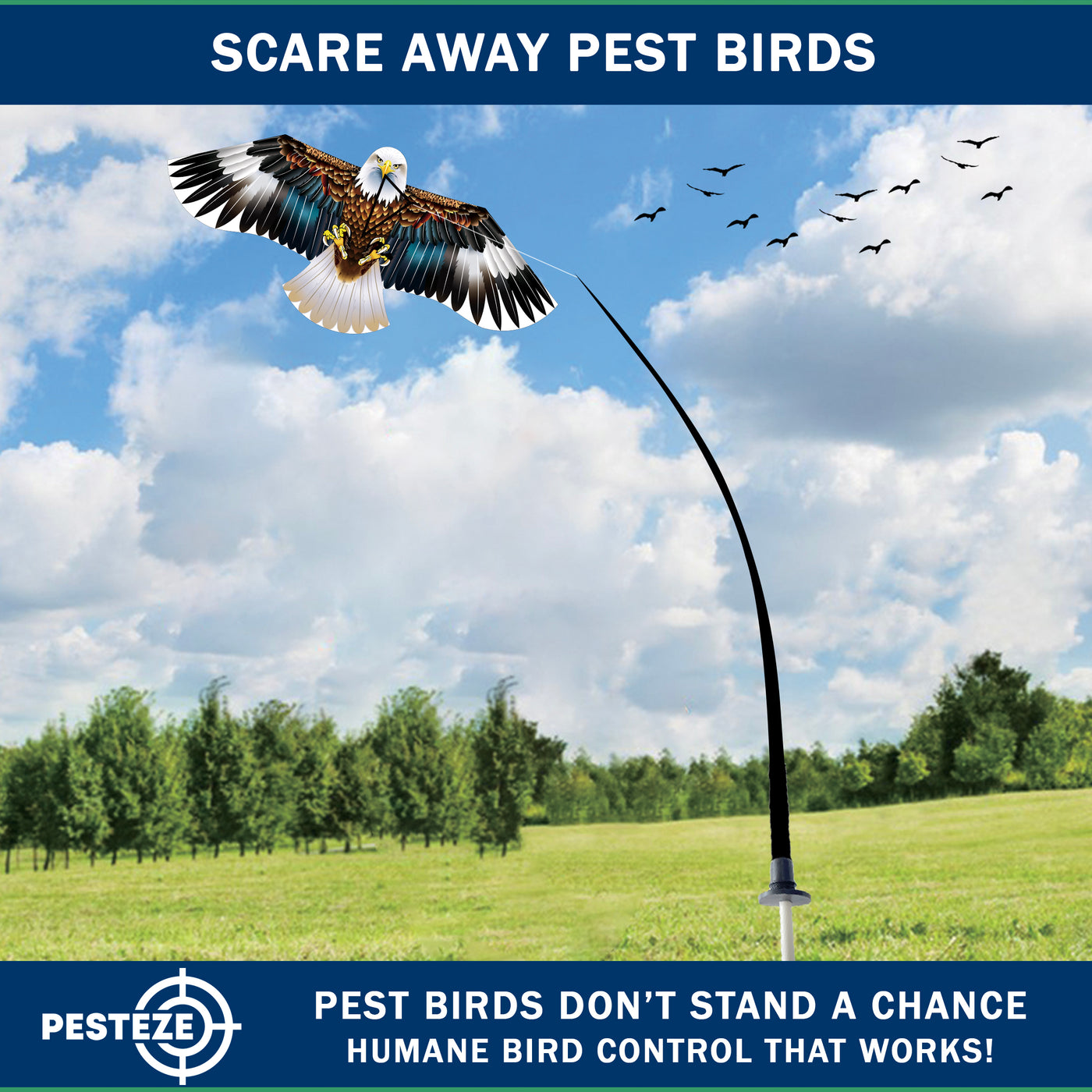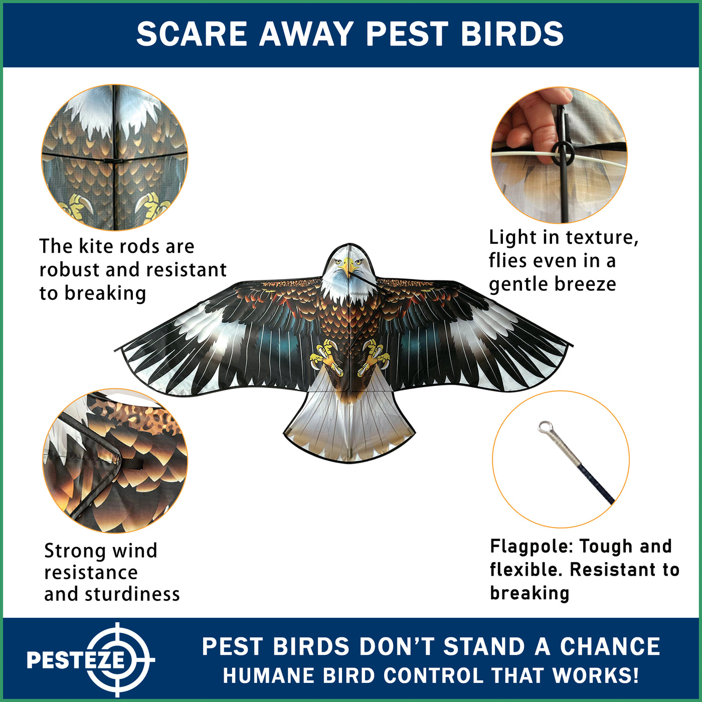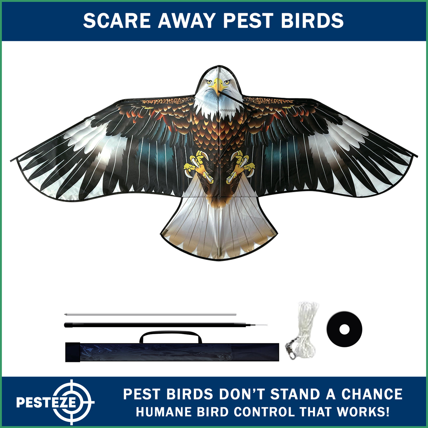 • PRODUCT: PESTEZE® USA Blue Eagle Kite: Huge 63x29 Inch Kite with 13 Ft Flagpole. Provides Humane Bird Deterrence in Yards & Farms. Protects Vegetables, Fruits & Crops from Pest Birds & Critters