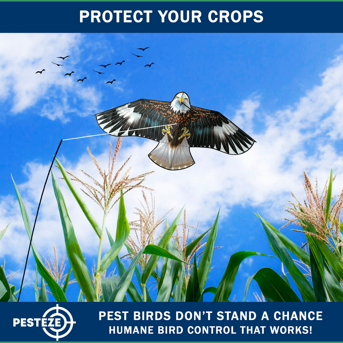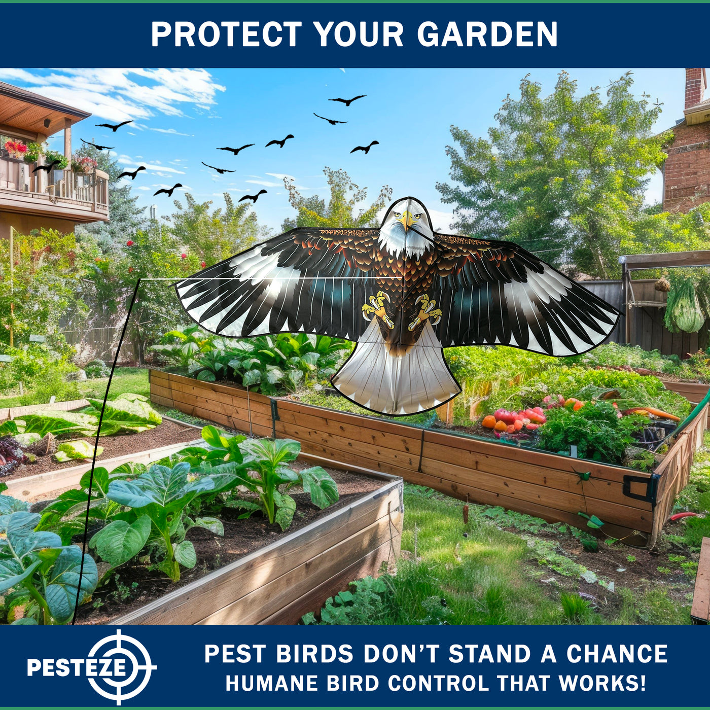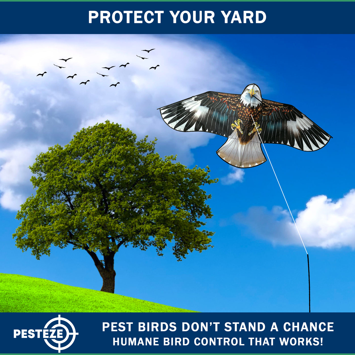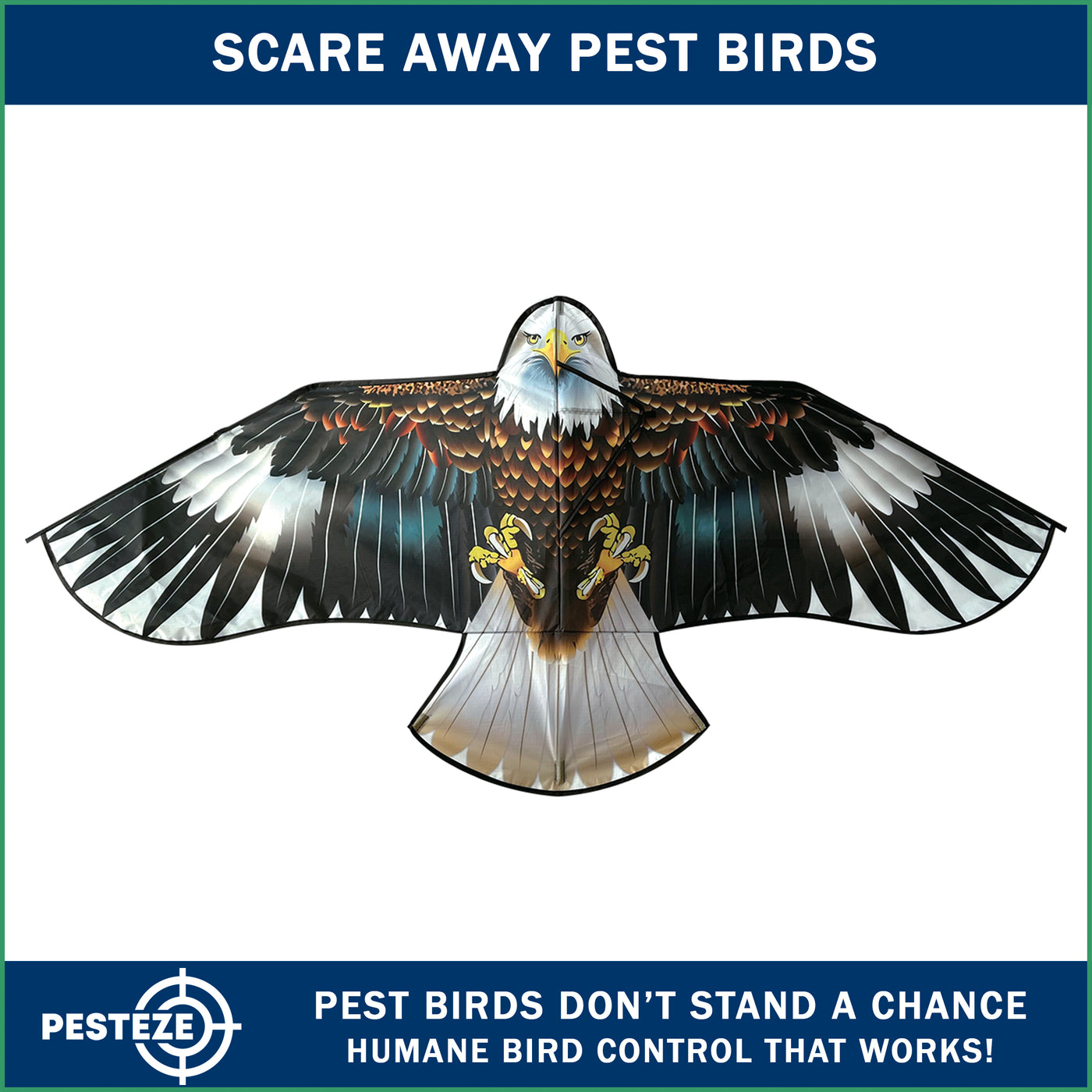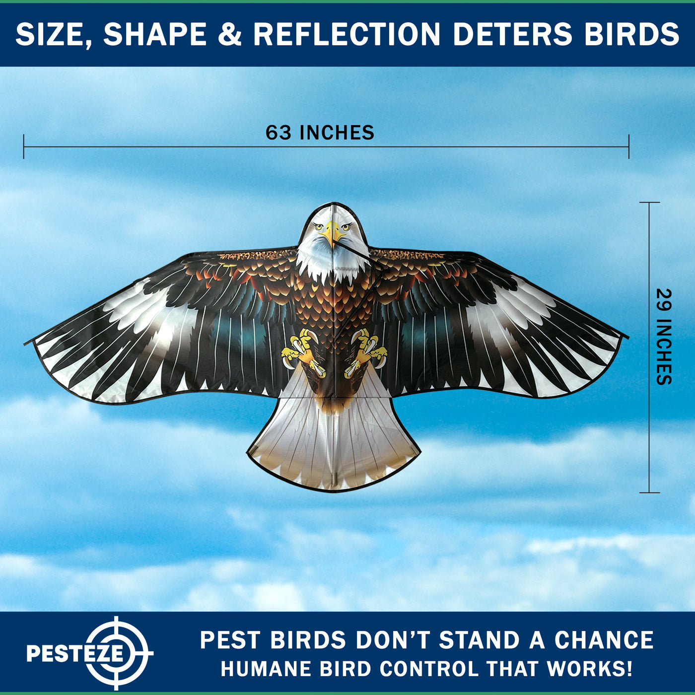 • PRODUCT: PESTEZE® USA Blue Eagle Kite: Huge 63x29 Inch Kite with 13 Ft Flagpole. Provides Humane Bird Deterrence in Yards & Farms. Protects Vegetables, Fruits & Crops from Pest Birds & Critters