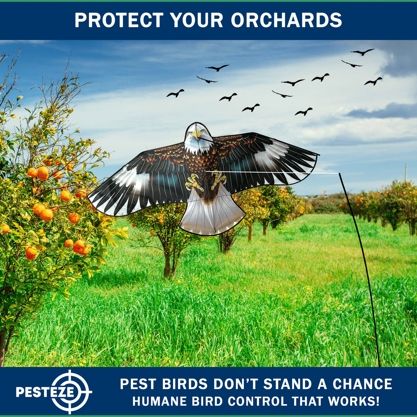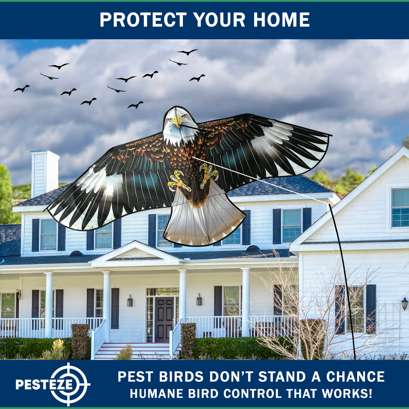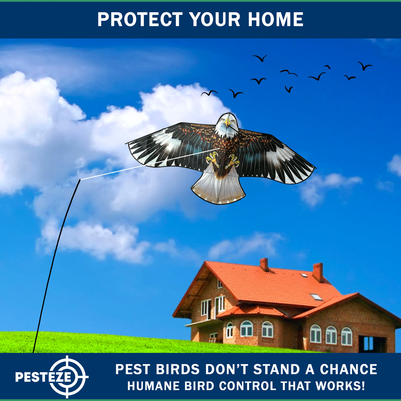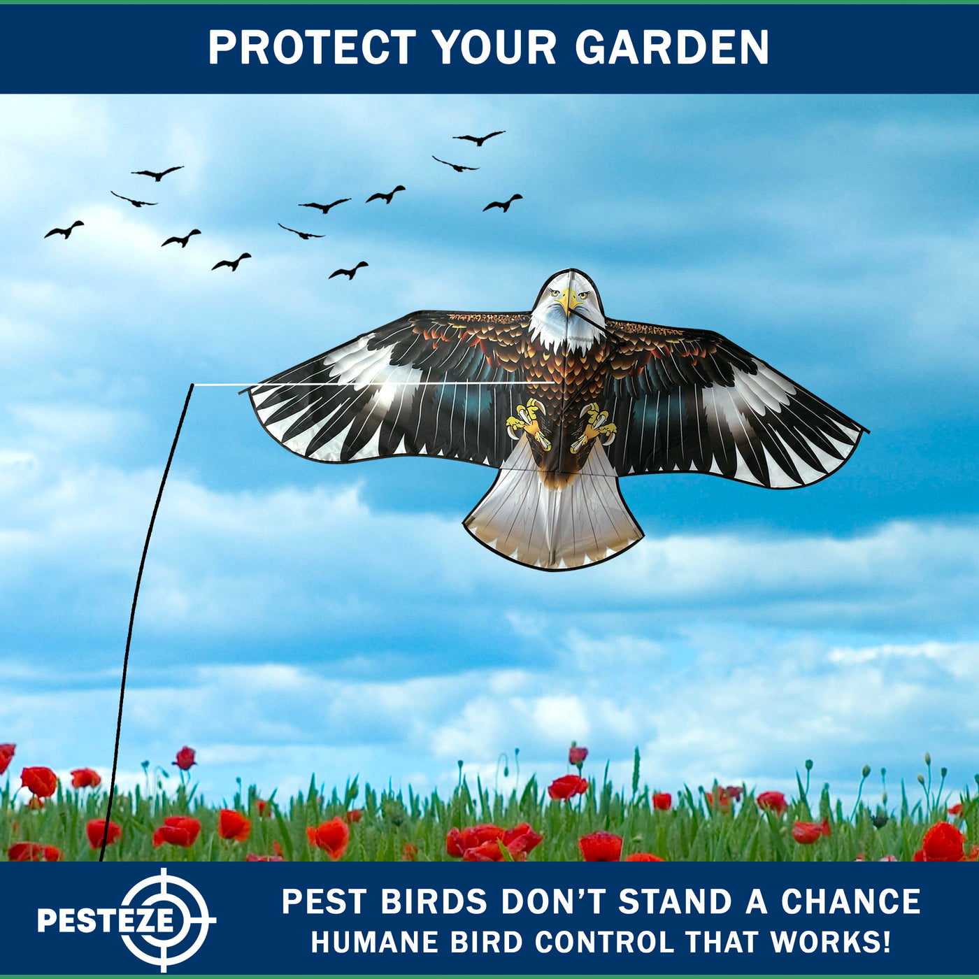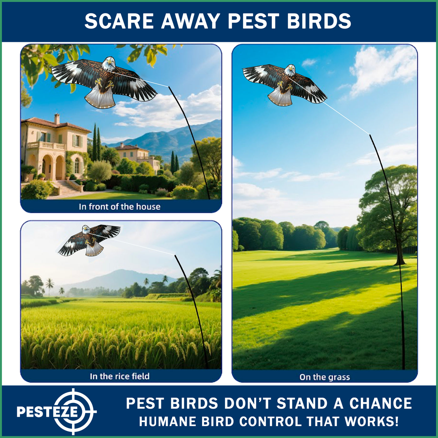 • PRODUCT: PESTEZE® USA Blue Eagle Kite: Huge 63x29 Inch Kite with 13 Ft Flagpole. Provides Humane Bird Deterrence in Yards & Farms. Protects Vegetables, Fruits & Crops from Pest Birds & Critters