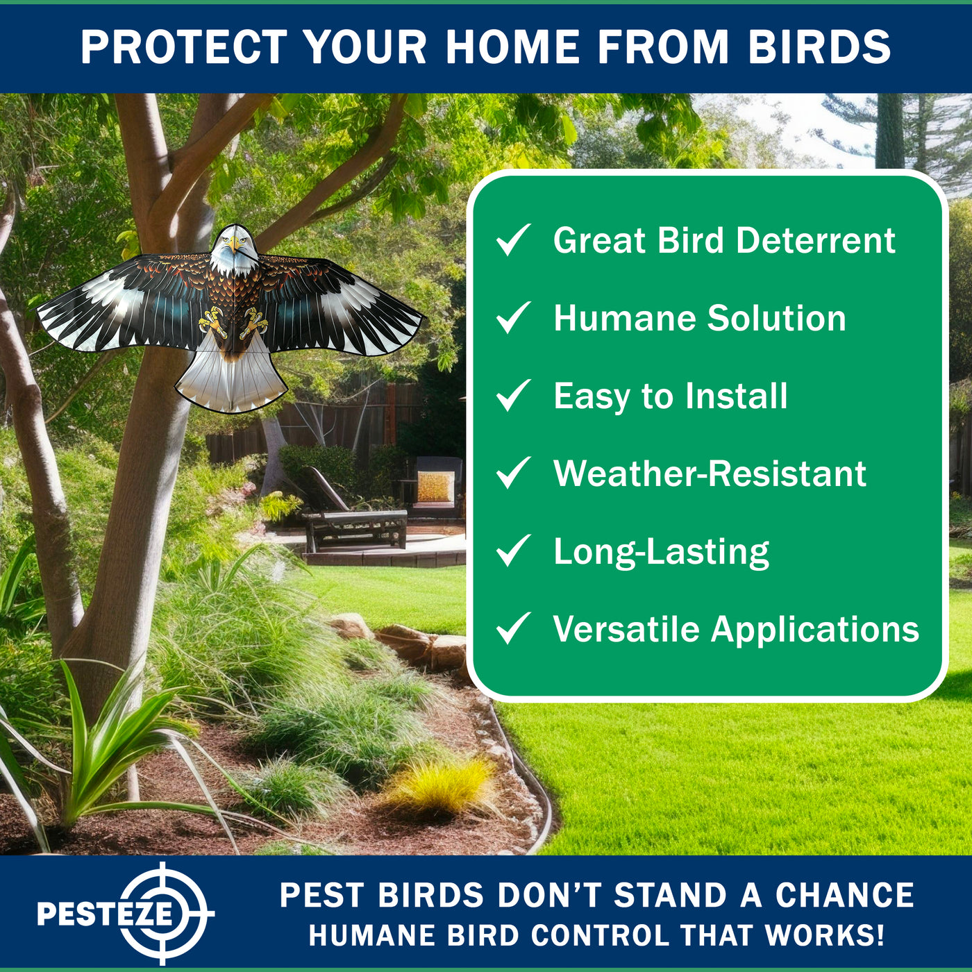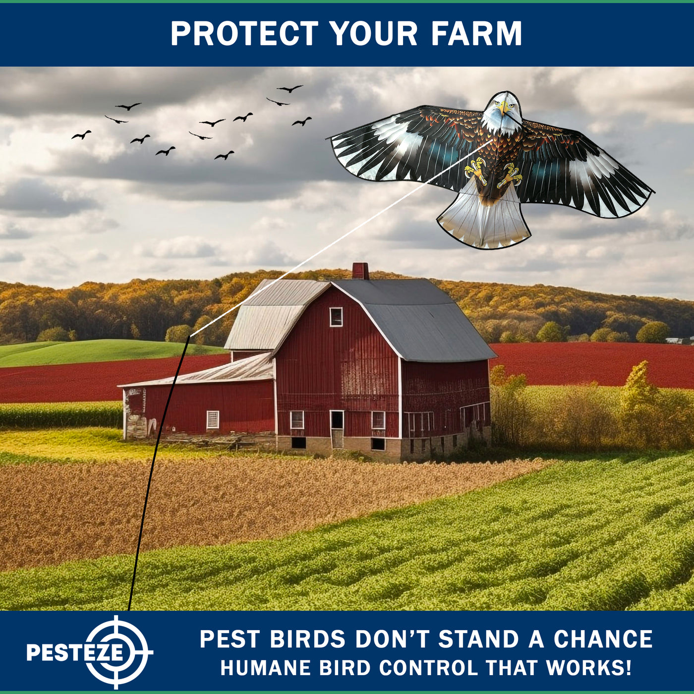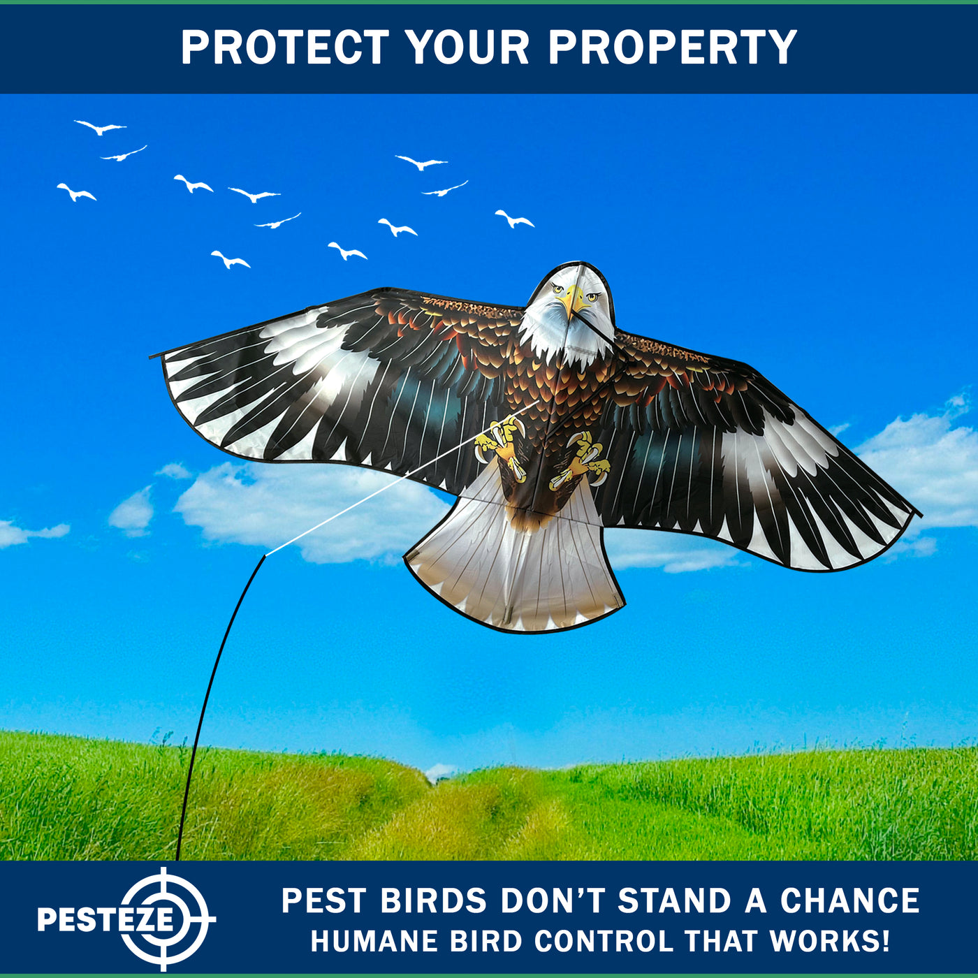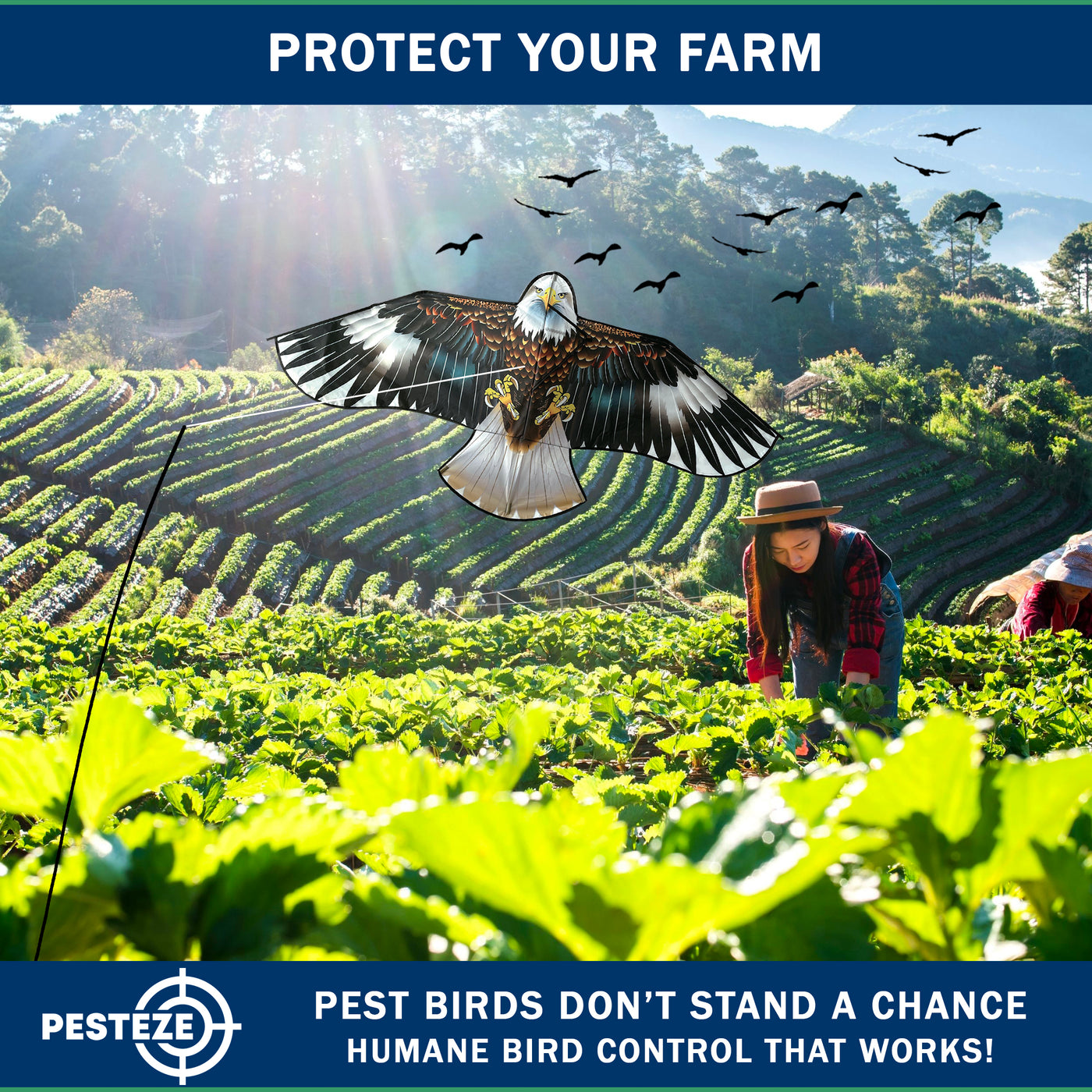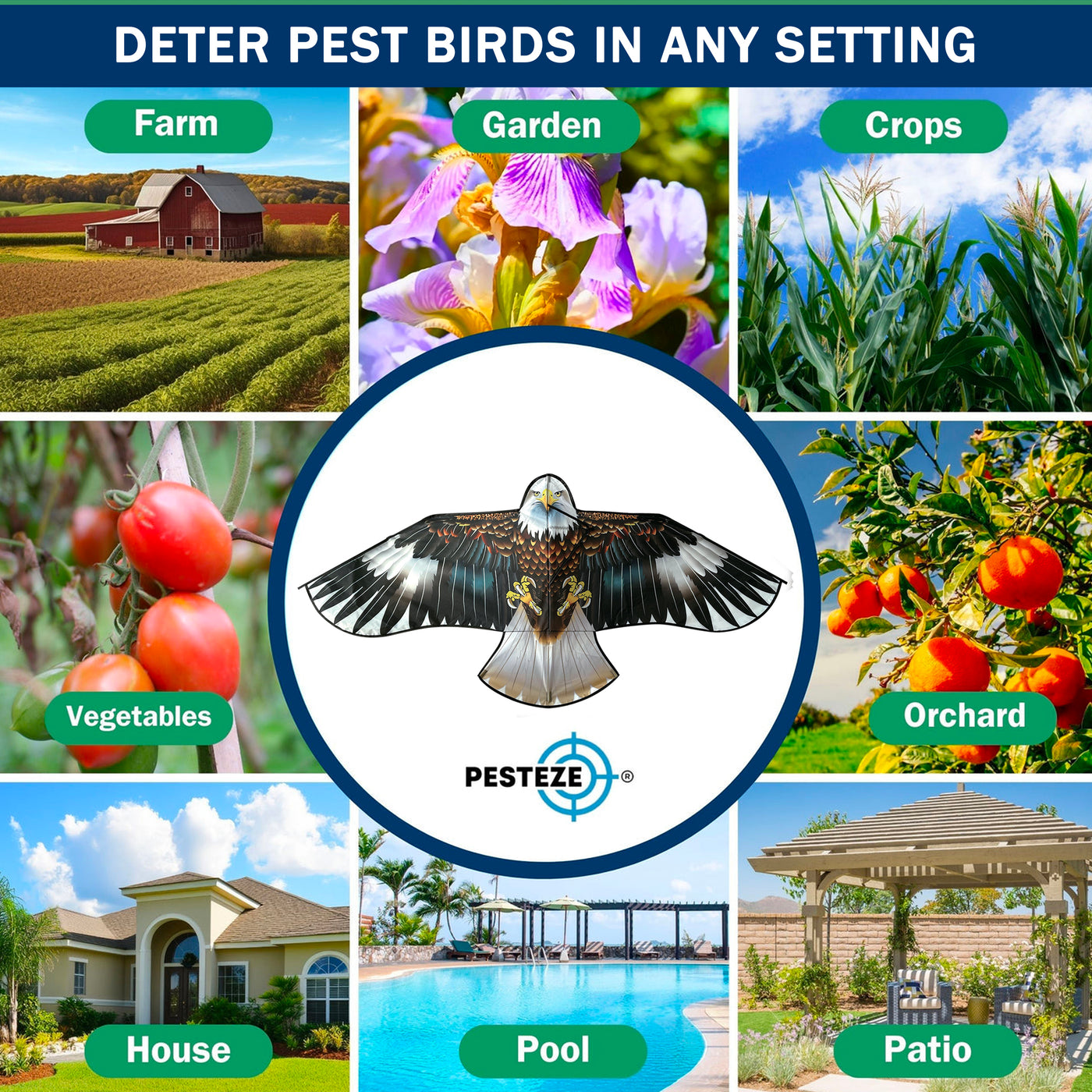 • PRODUCT: PESTEZE® USA Blue Eagle Kite: Huge 63x29 Inch Kite with 13 Ft Flagpole. Provides Humane Bird Deterrence in Yards & Farms. Protects Vegetables, Fruits & Crops from Pest Birds & Critters