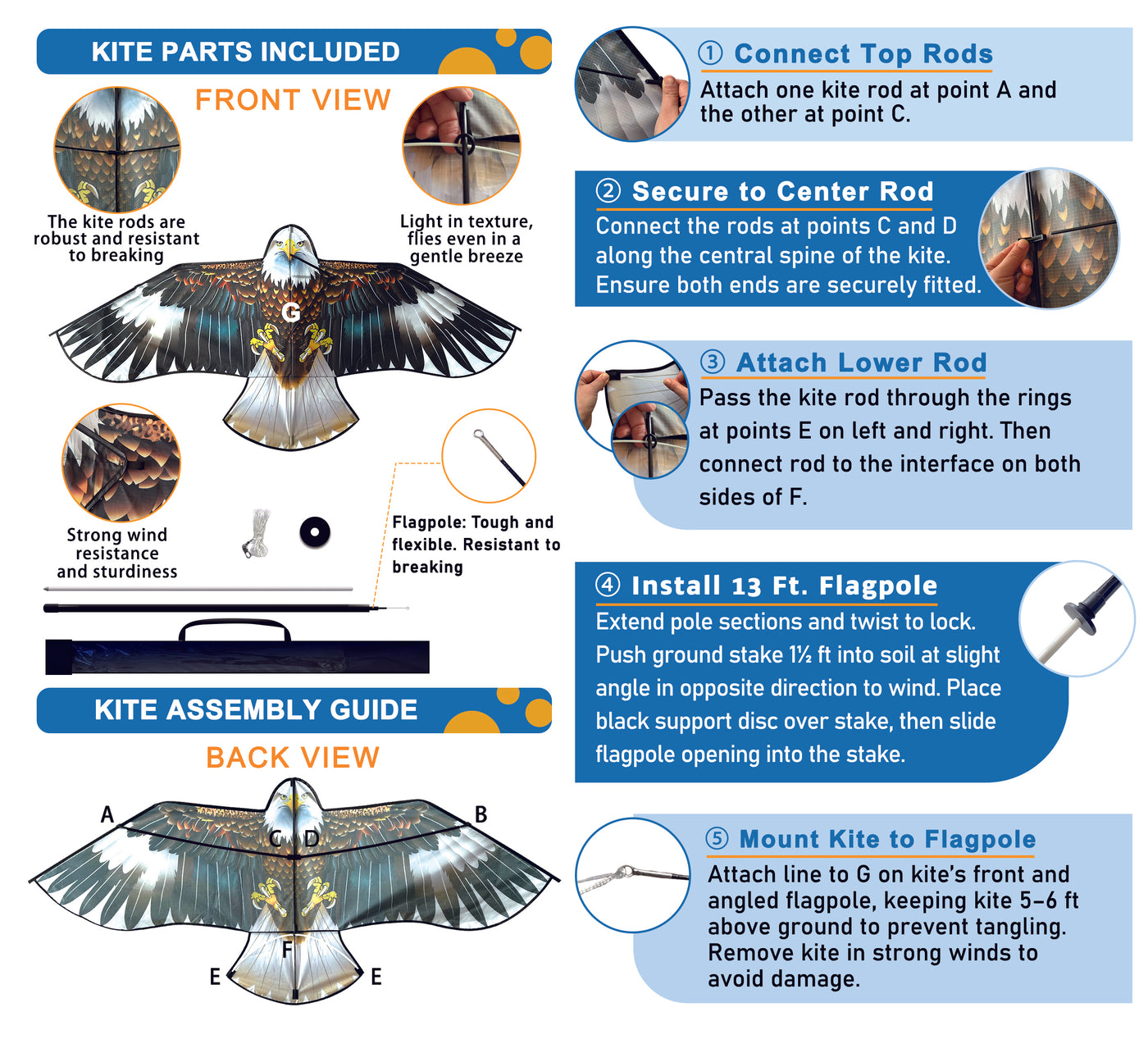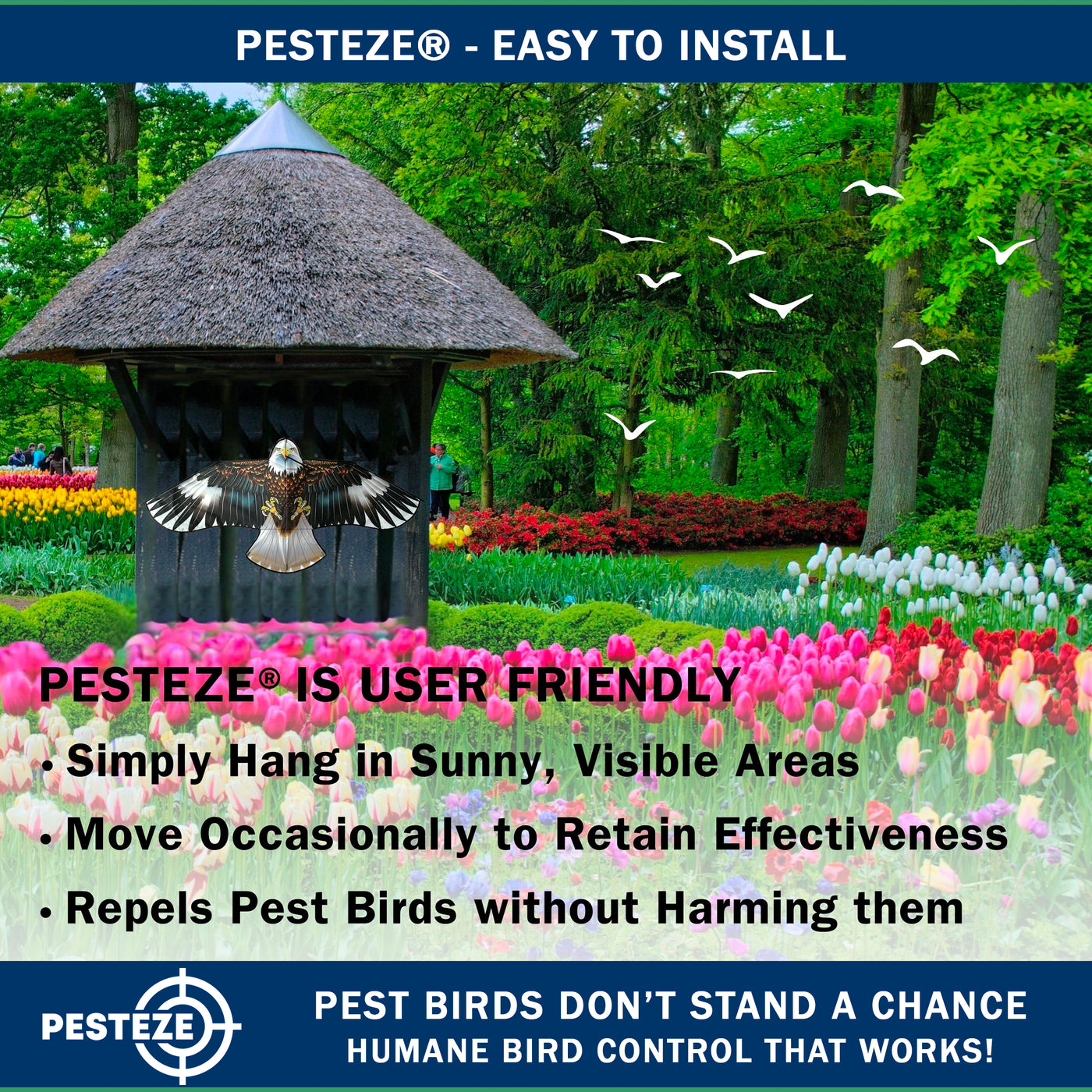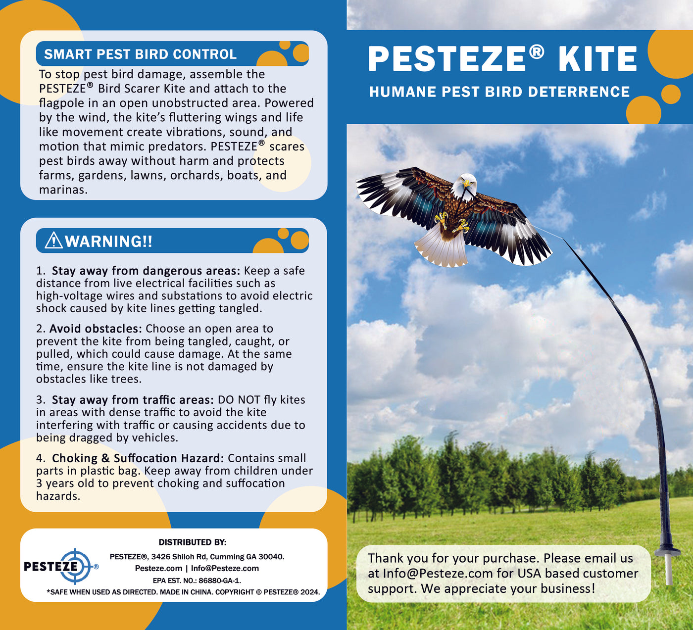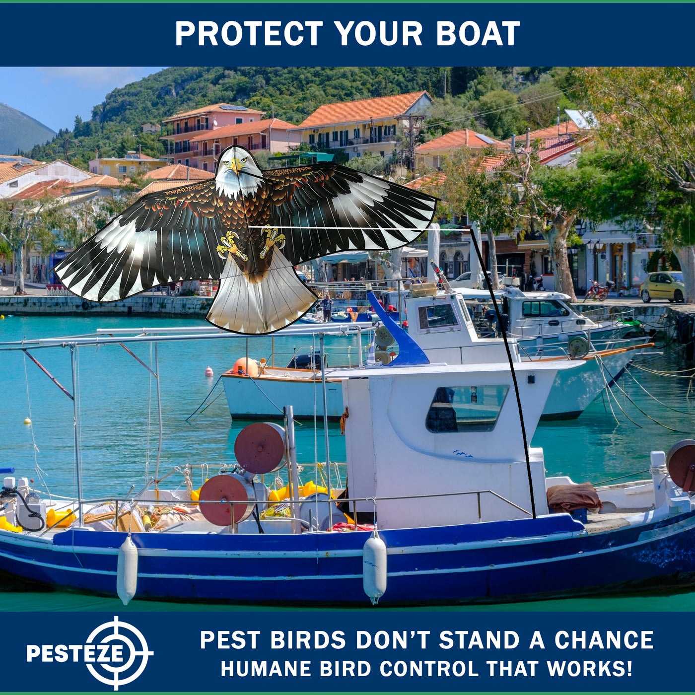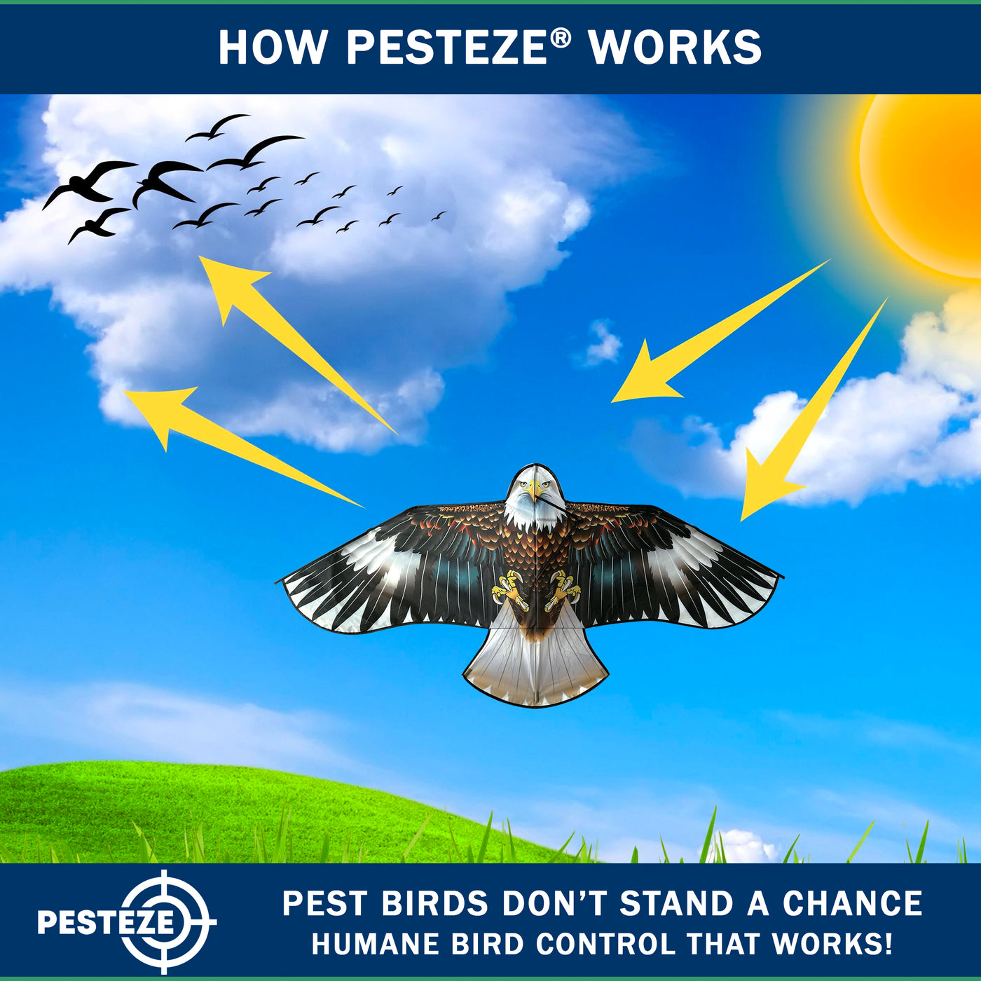 • PRODUCT: PESTEZE® USA Blue Eagle Kite: Huge 63x29 Inch Kite with 13 Ft Flagpole. Provides Humane Bird Deterrence in Yards & Farms. Protects Vegetables, Fruits & Crops from Pest Birds & Critters