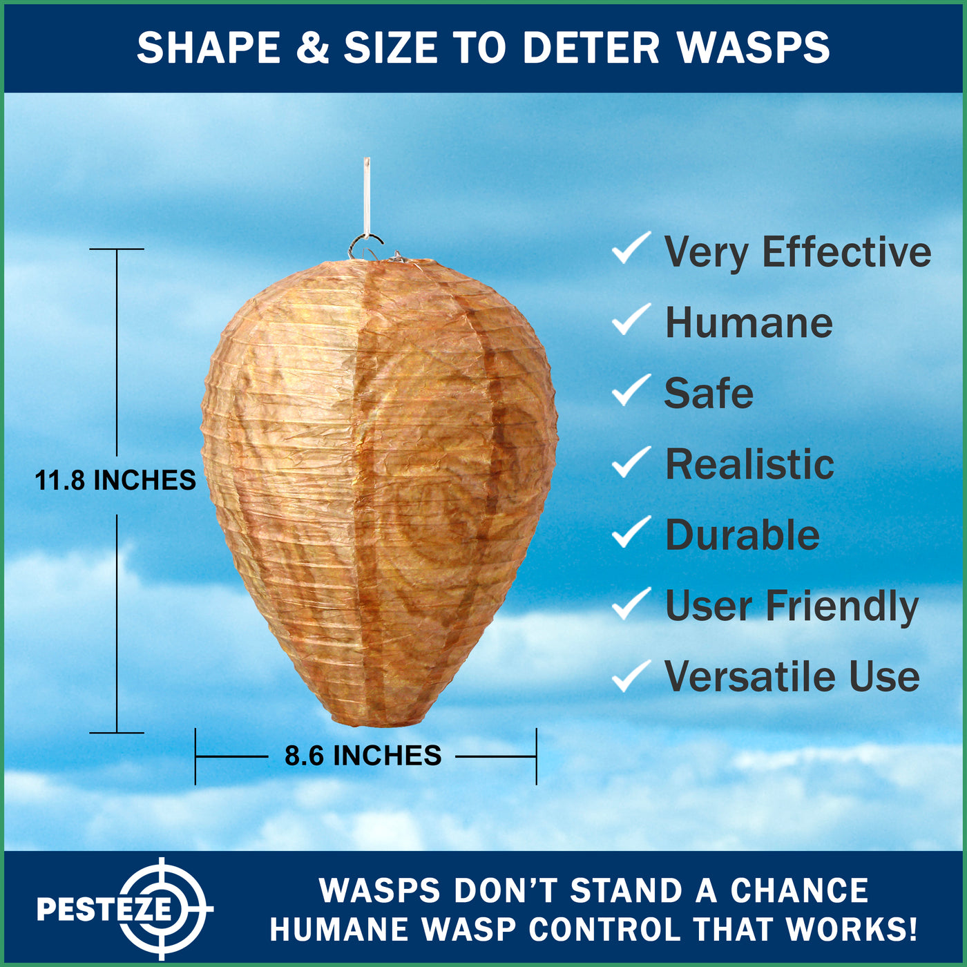 Stinging insects such as wasps, hornets, and yellow jackets are naturally territorial. The PESTEZE® USA Brown Waterproof Hanging Wasp Decoy Nest is designed to work with that instinct. By visually simulating an established hive, this outdoor pest deterrent helps discourage new colonies from building nests nearby.