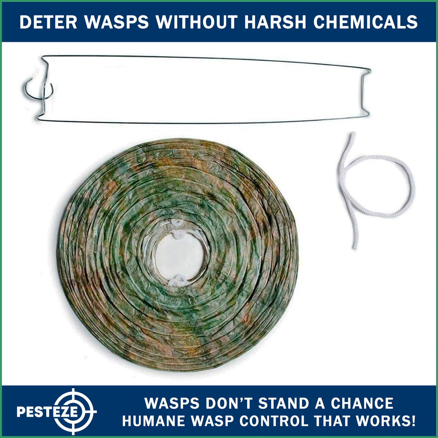 • PRODUCT: PESTEZE® USA Green Camo Paper Hanging Wasp Decoy Nest [2 Pack] Deters Several Wasp, Hornet & Yellow Jacket Species without Harsh Chemicals by Simulating Enemy Hives.
